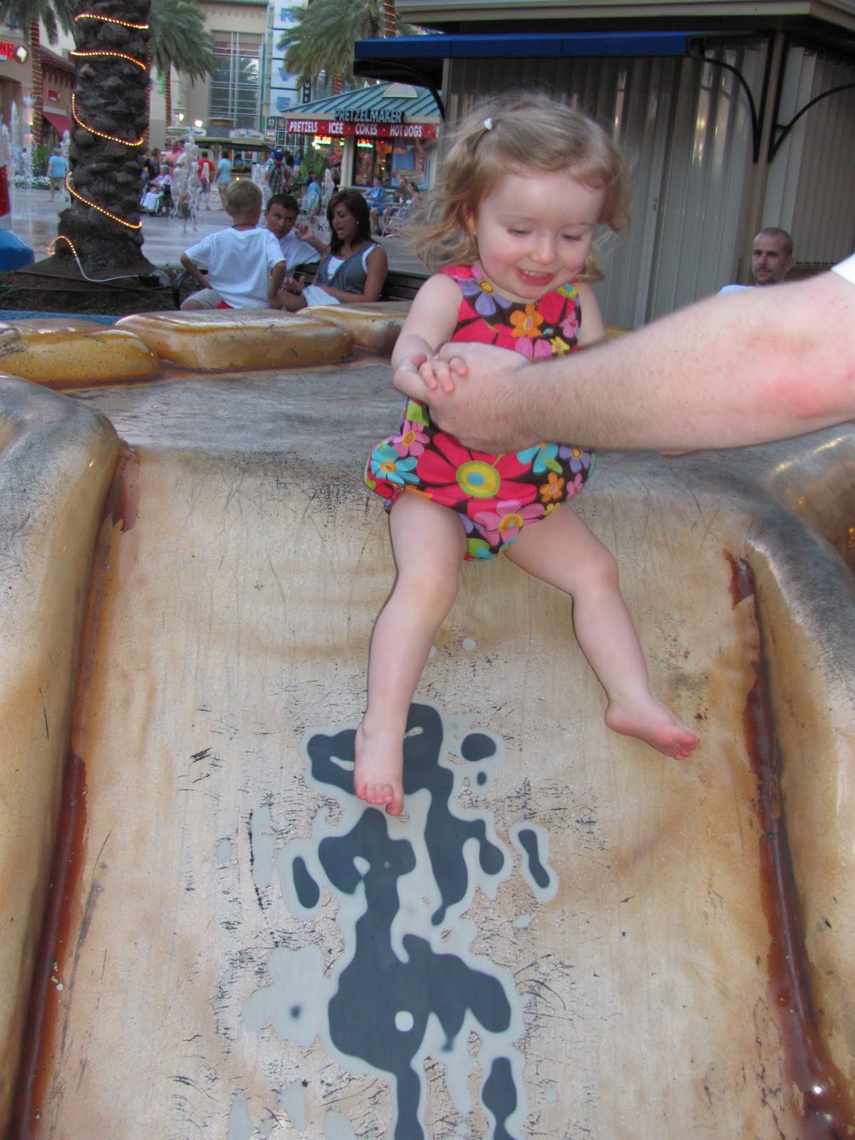 After supper Robert and I took Ellington to an outdoor mall so that she could play in the water. The water was a little intense for her so she didn't get in. Luckily, there was a playground area so she enjoyed that instead!
